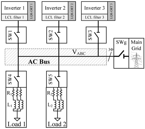 To demonstrate the effectiveness and the applicability of the islanded model, a microgrid scenario with three inverter-based generators and two loads was proposed, as shown in Figure 21. Connection switches were located at the output of each inverter, at the input to each load, and at the point of connection with the main grid. Without loss of generality, all three inverters had the same LCL filter components to simplify the design procedure. However, the design procedure shown in this section is also suitable for microgrids with different LCL filter components. The parameter specification for the microgrid scenario is shown in Table 2.