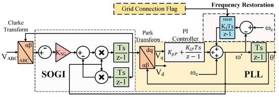 To synchronize each inverter with the AC bus, a second order generalized integrator (SOGI-PLL) is implemented as shown in Figure 23 [33]. The output of the SOGI-PLL is used to perform the dq transformation of the input and output signals of the LQI controller. When the grid connection is lost, the operating frequency of the microgrid drops and the frequency restoration loop is activated. The frequency restoration loop integrates the frequency error and compensates the PLL operating frequency . This way, the microgrid frequency returns to nominal values in islanded mode. The expression of the output frequency of the SOGI-PLL with the proposed frequency restoration loop is given by