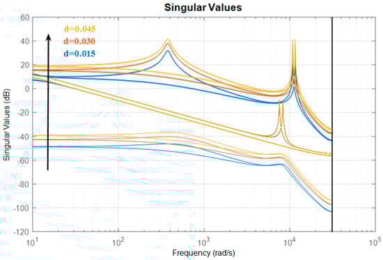 To analyze the transient response and frequency response, the singular value diagram is shown in Figure 25. It can be noticed that as d increases, the bandwidth of the open-loop response increases, which makes the system more susceptible to process noise. After analyzing the performance using the three different methods, the droop gains shown in Table 3 were selected: