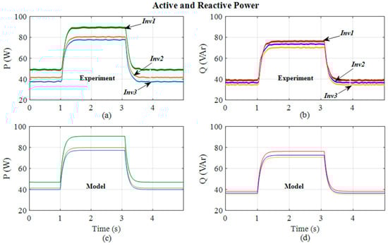 To assess the performance of the proposed model and to validate the closed-loop model, the experimental setup from Figure 4 was used. The experimental response was compared against the mathematical response of the closed-loop model under a step reference of 400 W and 400 VAr. As the closed-loop inputs from (30) include the grid voltage, the acquired voltage measurement from the power authority was transformed to the dq frame and was used as the input of the closed-loop mathematical model.