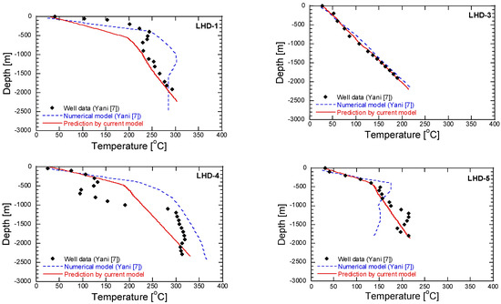 The results of the temperature predictions under the natural state condition are shown in Figure 17. These results were compared to the actual measured data and the numerical model reported by Yani [8]. As shown in Figure 17, the temperature in well LHD-1 is lower than the measured data. However, our model predictions show a relatively good agreement with the measured data at the bottom of the well. The predicted temperature in well LHD-3 matches the measured temperature data. The temperature in this well is similar to the thermal gradient, because well LHD-3 is located outside of the main geothermal reservoir area.