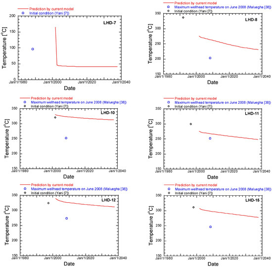 The evolution of the reservoir temperature for long-term production (36 years) has been simulated and is shown in Figure 19. Although all the wells have an initial temperature more or less than the initial condition data, the modeled values are still in good agreement. The temperature of injection well LHD-7 began to decline after the cold-water injection was started. Production wells LHD-11 and LHD-17 are representatives of all the production wells in Cluster-4 and Cluster-13, respectively. The reservoir temperature in LHD-11 was seen to decrease from 275 °C to 248 °C over the 36-year period, while the temperature in production well LHD-17 was seen to decrease from 282 °C to 238 °C in 30 years. The time required for the process of the decreasing reservoir temperature is longer for representative well LDH-11 because almost all of the well positions in Cluster-4 are farther from the injection well. The wellhead pressure data from the seven production wells (LHD-8, LHD-10, LHD-11, LHD-12, LHD-15, LHD-17, and LHD-18) at the Lahendong geothermal field are used for comparison [44]. The data were collected in June 2008 and converted to temperatures using the table of properties for saturated water [45].