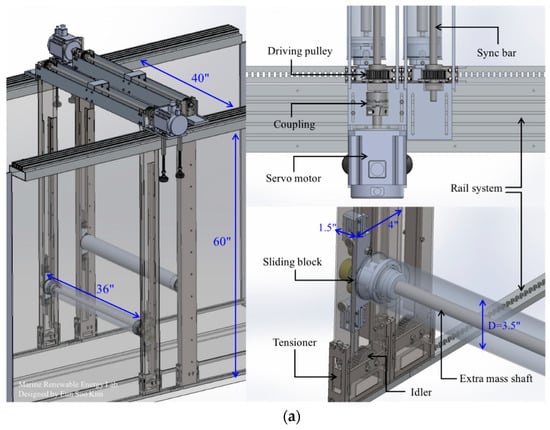 A VIVACE Converter model with the Vck controller mounted: (a) VIVACE converter 3D model. (b) The servomotor with the Vck (Virtual spring-damping system) shaft. (c) The single-cylinder converter in the LTFSW channel (top view). (d) Cylinder model with the adjustable mass axis.
