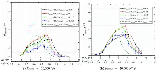 (2) Typically, in the VIV region, the highest harnessing efficiency occurs at the beginning of the upper branch [9] where power is locally high and amplitude has not reached its peak. Per Equation (11), at this point, the oscillator has a high numerator and low denominator. After the local optimum, the efficiency drops (Figure 7). For the nonlinear cubic stiffness, however, one noticeable difference in the efficiency in the upper branch is that all the efficiency graphs remain nearly straight lines with a slow drop. This becomes more obvious as the cubic parameter Kcubic increases. The lower cubic nonlinear stiffness behaves similarly to its linear counterpart. At the end of the upper branch, the harnessing efficiency of the nonlinear cubic oscillator is much higher than that of the linear counterpart, which is the result of the expanded oscillation range and the higher equivalent restoring force.