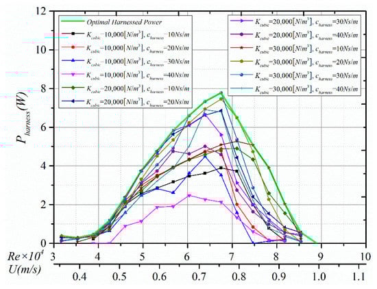 In all three nonlinear oscillators, for low harnessing damping (charness = 10 Ns/m), the harnessed power is consistently high in all the VIV regions, especially in the higher flow speeds, because of the hardening restoring force. Drops are less abrupt than for higher damping. This is contrary to the linear oscillator performance (Figure 6d), where the lower end of damping ratio values typically performs well only in the lower flow velocity. In other regions, the higher damping outperforms the lower damping more than twice.