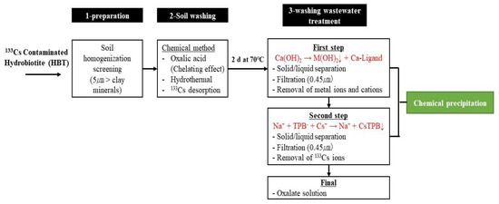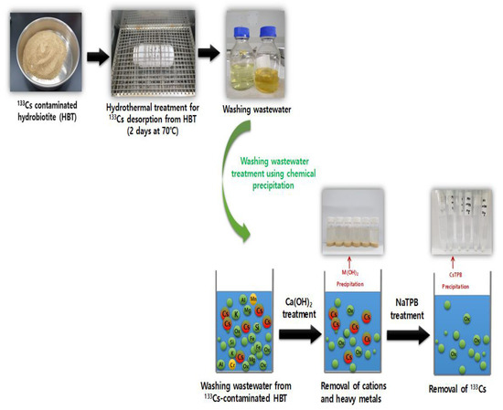 Schematic diagram of soil washing and washing wastewater treatment of cesium (Cs)-contaminated hydrobiotite (HBT).