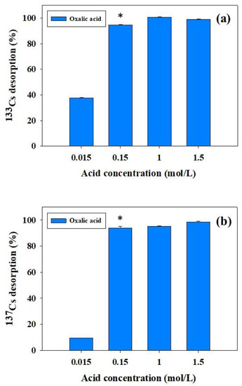 The efficiencies of oxalic acid desorption of Cs were compared in experiments conducted at 70 °C for 2 days in a shaking heating bath. The desorption efficiency improved with increasing desorbent concentration; the maximum efficiency for Cs desorption in both the radioactive and non-radioactive experiments was 99.05% and 98.45% at 1.5 M, respectively (Figure 2).