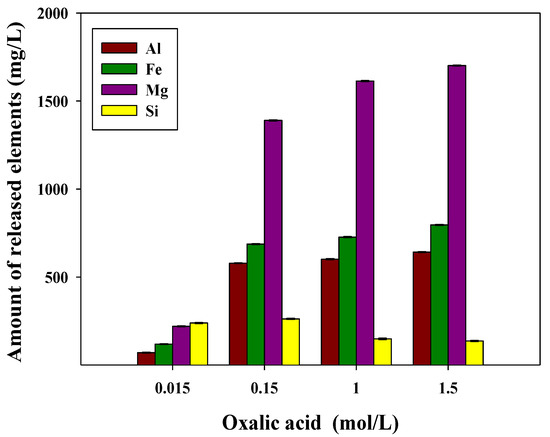 The 133Cs–HBT was incubated for 2 d in various concentrations (0.015, 0.15, 1, and 1.5 M) of oxalic acid. The concentrations of the major elements released from 133Cs–HBT, including Al, Fe, Mg, and Si, were monitored to estimate the degree of simultaneous dissolution of clay minerals. As shown in Figure 3, the extraction efficiency of elements was improved by increasing the desorbent concentration. From 0.15 M of the desorbent (oxalic acid), the leaching of cations began to increase, and among the major elements of HBT, Mg (1389.60 mg/L) leached most, followed by Fe (687.25 mg/L), Al (578.90 mg/L), and Si (262.50 mg/L).