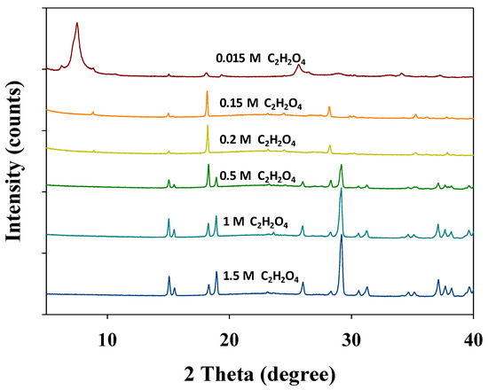 X-ray diffraction (XRD) patterns of 133Cs–HBT treated with various concentrations of oxalic acid. The solid/liquid samples were separated using a centrifuge following desorption treatment, and the dried solid particles were analyzed using XRD.