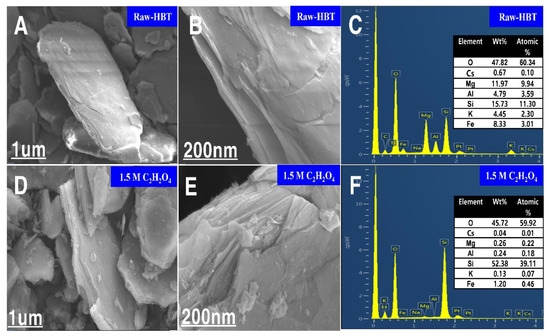The corresponding SEM micrographs and energy dispersive spectroscopy (EDS) analysis are shown in Figure 5. Clear morphological changes were observed in the SEM image of HBT after acid treatment. Figure 5A–C show the typical morphology and EDS-elemental mapping of the untreated, slightly expanded clay (HBT). Figure 5D–F show the morphology and EDS-elemental mapping of the changed surface of HBT after 1.5 M treatment with oxalic acid. The raw-HBT was observed to have a unique sheet texture and smooth foundation surface at the edges, with no significant change.