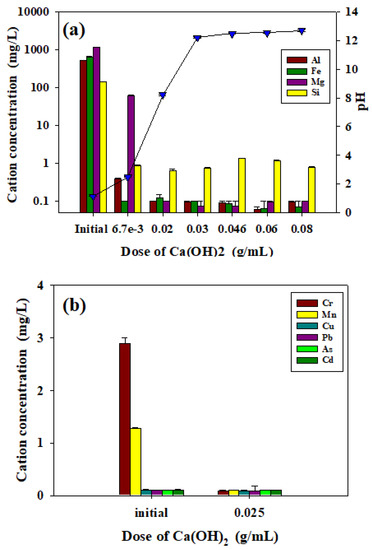 (a) Determination of optimum conditions and pH changes for the removal of metal ions by Ca(OH)2 dose in washing wastewater after 0.15 M oxalic acid treatment of HBT-133Cs contaminated clay minerals and (b) removal of heavy metal. (n = 2, mean ± standard error of mean).
