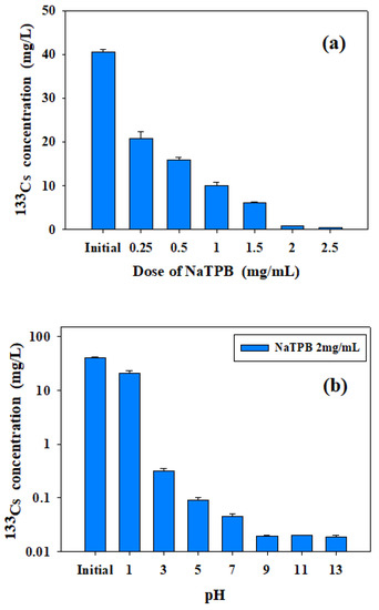 In order to find the optimal dose of NaTPB, the cation-depleted 0.15 M oxalic acid washing wastewater and NaTPB were mixed at a mass ratio of 0.25 mg to 2.5 mg/mL and reacted overnight at 25 °C in a shaking incubator. As shown in Figure 7a, it was confirmed that the 133Cs ions in the solution decreased as the NaTPB dose increased. In addition, when 2 mg and 2.5 mg NaTPB/10 mL solutions were added, 133Cs ions were removed to below 0.68 mg/L and 0.46 mg/L, respectively. As shown in Figure 7b, in order to find the optimal pH range, various pH levels of oxalic acid washing wastewater were prepared from pH 1 to 13 and reacted by adding 20 mg of NaTPB to each 10 mL solution (wastewater).