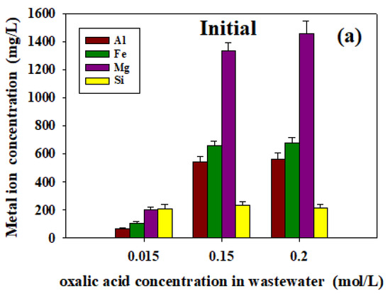 In Figure 8, the optimum dose and pH conditions of Ca(OH)2 and NaTPB we found were actually applied to the washing wastewater after the oxalic acid desorption experiment from 0.015 to 1.5 M concentration. In the first step, to remove cations from the desorption wastewater, Ca(OH)2 was treated at a mass ratio of 0.025 g/mL, and in the second step, 2 mg/mL NaTPB was added to the cation-depleted wastewater in the previous step to remove Cs in the solution. As reflected in Figure 8b, in the first step, when the cations were compared with the initial concentration of Al, Fe, and Mg, these were removed to below 0.1 mg/L, and Si was reduced to below 1.1 mg/L in 0.2 M oxalic acid wastewater. Subsequently, as shown in Figure 8c, when the Ca(OH)2 was treated, there was almost no change in the concentration of Cs, but it was confirmed that Cs was removed to below 0.1 mg/L in each wastewater sample when the NaTPB precipitant was treated.