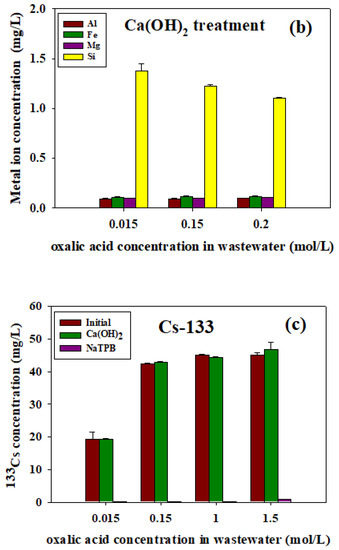 After the desorption experiment with oxalic acid at various concentrations: (a) the initial concentration of metal ions in the washing wastewater, (b) the concentration of cations after Ca(OH)2 0.025 g/mL treatment, and (c) the concentration of 133Cs after 0.025 g/mL Ca(OH)2 and 2 mg/mL NaTPB treatment. (n = 2, mean ± standard error of mean).