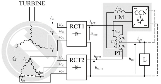 In the presented case, there is a pair of three-phase windings in the stator, one of them connected in the “star” and the second in the “delta” configuration. The voltages at the terminals of both windings should have the same value. The windings are burdened by two independent six-pulse diode rectifiers (denoted as RCT1 and RCT2). A power electronics converter (i.e., the “current modulator”; CM) is included at the output of each rectifier, shaping their output currents (, ). The CM consists of three main parts: the power electronics converter block (CCN), output inductor (), and power pulse transformer (PT). All these elements make up the power electronics controlled current source. The CM generates the output current (), whose characteristics are defined later. This current flows through the primary winding of the pulse transformer (the PT block) with the secondary winding divided. The secondary winding of the transformer interconnects the outputs of both rectifiers, which means that changing the shapes of the output currents of both rectifiers is possible by applying the modulator output current flowing through the transformer.