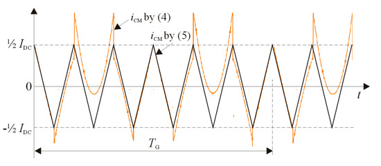 However, taking into account a three-phase electrical system, the current given by Formula (4) should be replaced by a current that has the same phase shift—in respect of a voltage in a given phase. So, the fundamental frequency of the current generated by the modulator should be equal to six times that of the generator output voltage frequency (). Very close to Formula (4) is the current with, e.g., a triangular shape [27,28,29]. This is given by the following equation: