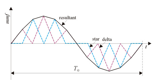 Theoretical shape of magnetomotive force (mmf) associated with group of “star” and “delta” connections and the resultant mmf.