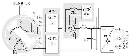 - Generator side converter (GCN) with two diode rectifiers (RCT1, RCT2);