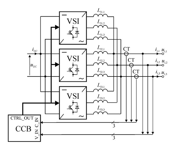The demand for high output power of the PCN necessitates a suitable topology for this. In this case, an interleaved converters topology was chosen. In contrast to the usual parallel connection of power devices, this topology allows multiplication of the pulsation frequency (caused by the PWM carrier frequency) in the converter’s output current. This multiplication is done by the factor of where is the number of legs per converter phase. As a result of the converter operation, the magnitudes of the current ripples can be reduced significantly compared to the traditional (i.e., single-channel) converter solution [31,32]. In the case of the present work, it was assumed that = 3. The block diagram of the PCN is shown in Figure 5.
