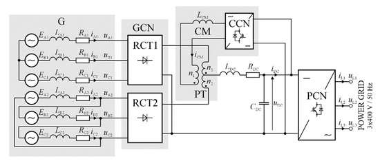 If the proposed system is designed to cooperate with the power grid, a dedicated converter connecting the system with this grid is necessary. Typically, this converter is a three-phase voltage source inverter (VSI). This role is fulfilled by the power grid converter (PCN) block in Figure 4. In such a system configuration, an inductor () should appear in its DC circuit. The purpose of the inductor is both to maintain the modulator output current continuity—which is necessary for obtaining proper operation of the CM—and to reduce ripples in this current, which are caused by the operation of the diode rectifiers. A large capacitor () is connected to the PCN input terminals.