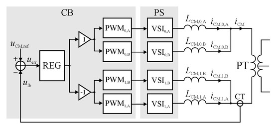 The CCN (Figure 6) consists of two parts—control block (CB) and power stage (PS). The block denoted as REG is the output current regulator, while blocks are half-bridge inverters and CT is a current transducer. At the output of the PS, both the set of inductors and the pulse transformer are included. In the case of the single-channel version of CM blocks, , , and were excluded from the circuit.