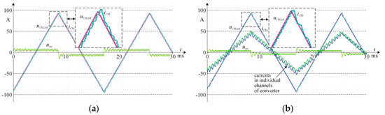 In turn, Figure 11 presents the waveforms of the currents in individual inverter channels, the reference grid current, and the resultant grid current for one phase of the PCN.
