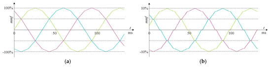 Figure 10 shows samples of the mmf in the stator of the PMSG as the result of the CM operation. For better visibility of the waveforms in Figure 10b, the magnitudes of these are enlarged ten-fold.