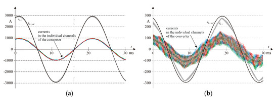 Waveforms of currents in individual inverter channels, reference grid current (black), and resultant power grid current (grey)—for one phase of PCN—when its output power is equal to the nominal value (a) and 10% of this value (b).