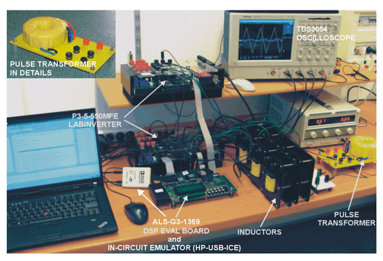 The control block in the laboratory prototype was based on the ALS-G3-1369 DSP evaluation kit [41] with Analog Devices Inc. ADSP-21369 SHARC® DSP. This system is specialized for such power electronics and industrial measurement applications, which require both high computation power of the CPU and high precision (in the sense of resolution) of the PWM signal generation unit. In the power stage of the modulator prototype, two P3-5-550MFE LABINVERTERs [41] were used. These universal power electronics converters are designed especially for R&D applications. The general view of the laboratory stand is shown in Figure 14.