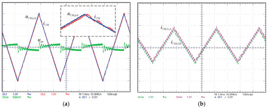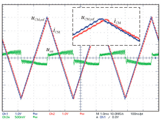 Tests of the laboratory model were carried out with the CM output current magnitude in the range of 10~100% of the rated value. Also, two cases of converter configuration were tested, i.e., single- and dual-channel. Figure 15 and Figure 16 show the exemplary waveforms in the laboratory prototype of the CM. For better visibility of the error signal waveform, its magnitude was enlarged. Also, these figures contain magnified portions of the graphs.