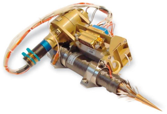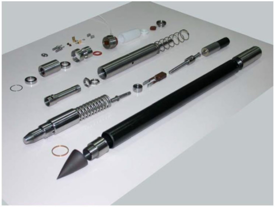 In the case of hammering, two methods of soil penetration can be distinguished: penetration during one short continuous process or discreet penetration by repeating the hammer action. An example of a continuous hammering penetrator is the PHILAE harpoon of the Rosetta mission [2,3,4,5] presented in Figure 1. The drive used in this case was a compressed gas cartridge. These harpoons were used to anchor the lander immediately after contact with the comet and enable it to further carry out its mission. However, the devices did not work properly, which was one of the main reasons for Rosetta’s mission goals not being fully realized. Generally, a big problem with this type of penetrator (moving in fast motion) is the cable unrolling (especially at low temperatures) and the inability to control the thrust and one-off operation.