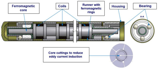 The second simplification concerned the rolling friction. The developed model did not include rolling resistance in the linear bearing used in the mechanism construction. The rolling friction force is directly proportional to the clamping force. It should be noted that in the case of the mechanism under consideration, the engine generates a thrust that is perpendicular to the contact force of the bearing balls. The main role of linear bearings is to ensure axiality between the core and the runner. Therefore, rolling frictional resistance has been omitted in the numerical analysis.