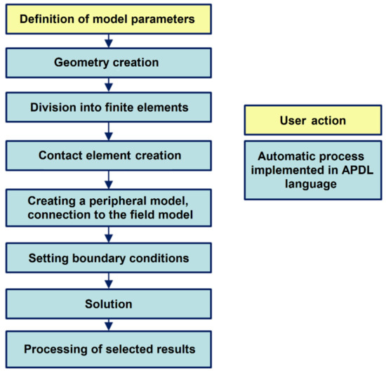 The numerical model described in this chapter was developed from scratch using the APDL language. This requires a greater effort at the model creation stage; however, thanks to this approach, the process of making changes in the construction parameters is not a problem. The most arduous processes in creating FEM models (such as creating geometry and division into finite elements) have been properly implemented and parameterized while creating the basic model, which allows their automatic execution. The methods of executing the numerical methods are shown in Figure 7, and the individual steps to create a model are shown in Figure 8 below [24,25,26,27].