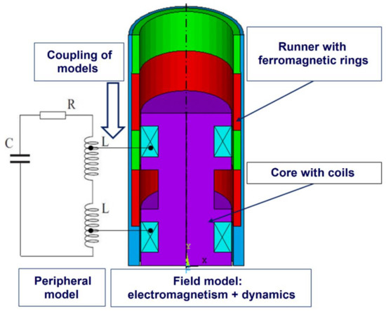 The numerical model directly takes into account the dynamic interactions between the three physical phenomena needed to simulate the operation of the device: electricity, magnetism, and dynamics. The figure shows, schematically, the components that have been included in the numerical model. Due to the construction of the device, the field submodel was simulated with a two-dimensional geometry, taking into account axial symmetry. The peripheral submodel is directly coupled to the field submodel by coupling the properties and degrees of freedom of the coils (Figure 9). As already mentioned, the model combines three different physical phenomena and finds a solution in the time domain (transient analysis) [28,29,30].