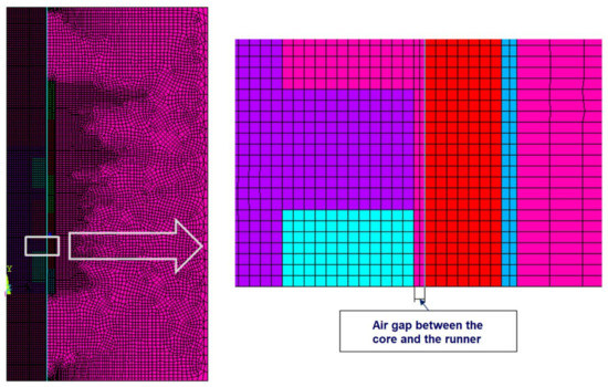 The third simplification concerned the geometry. Since the developed model is an axially symmetrical two-dimensional model, it presents an idealized system geometry (e.g., ideal engine axis). It also did not take into account an important design feature—undercuts in the motor core introduced to minimize the phenomenon of eddy current induction [36,37,38].