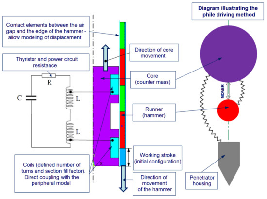 A single time step has been estimated at 0.00005 s, which provides a solution of about 80 steps to simulate a single device working action (depending on the configuration of the construction parameters). For each time step, the relative position between the core (counterweight) and the runner (hammer) is updated and included in the next time step. The displacement is carried out by moving elements simulating the runner along the contact elements. The model operation method is shown in Figure 11. In addition, the graphic presents a diagram showing the method of driving the device.