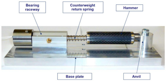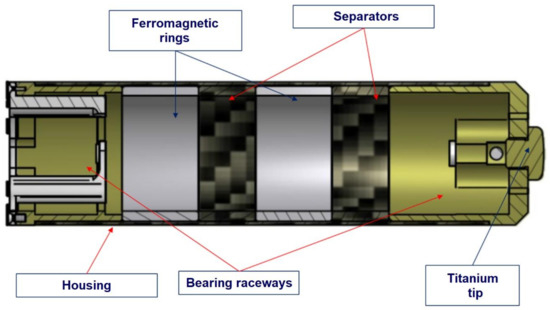 The main components of the hammer are ferromagnetic rings and a titanium tip—an element hitting the anvil. In addition, the hammer includes separators that are making a gap between two ferromagnetic rings and bearing raceways. All the components are connected by an external housing made of carbon fibers. Details regarding the construction of the hammer are shown in Figure 13.