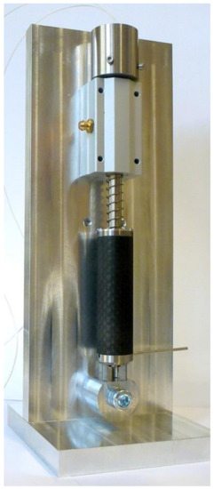 The last of the currently used devices in space missions to penetrate the surface of celestial bodies are penetrators characterized by low-velocity penetration. The main executive element in this type of solution is the so-called hammer. The component is accelerated and then hits the housing, resulting in the breaking of the surface (usually a few millimeters). A very important feature of this type of construction is the energy accumulator, which is—depending on the design—a capacitor (electrical energy) or a spring (mechanical energy). One of the institutions in the world where low-speed penetrator technologies are being developed is the Space Research Center (CBK) of the Polish Academy of Sciences. Examples of penetrators with a battery in the form of a capacitor are MUPUS [6] and CHOMIK [7]—a penetrator developed for the Phobos Grunt mission. The driving unit of both penetrators is an electromagnet with a movable dive (hammer), shown in Figure 2.