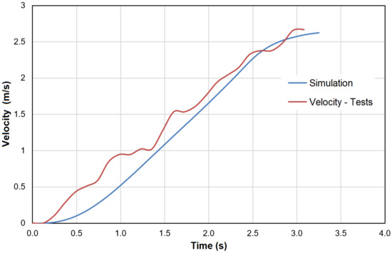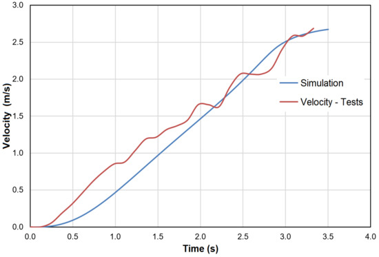 The authors are aware of a certain disadvantage of the model verification carried out in this way—the only checked parameters are the runner velocity of the model and electromagnetic phenomena that occur while the hammer is displaced. In order to verify the model more accurately, it would be necessary to carry out measurements of other physical quantities such as the discharge characteristics of the capacitor or current and voltage coil waveforms. However, at the project planning stage, it was decided to perform only the hammer velocity and displacement measurements, as those are the most important parameters for the device structure. The value of the velocity depends on the results of the electromagnetic analysis. The electrical energy accumulated in the capacitor is converted into magnetic field energy, which generates ponderomotive force and, finally, the displacement of the hammer. Given the above, it can be concluded that if the velocity results for the tests and simulations match, the entire energy conversion process occurs correctly. The results presented are therefore a sufficient basis for further simulations to determine the design parameters to ensure more efficient actuator operation.
