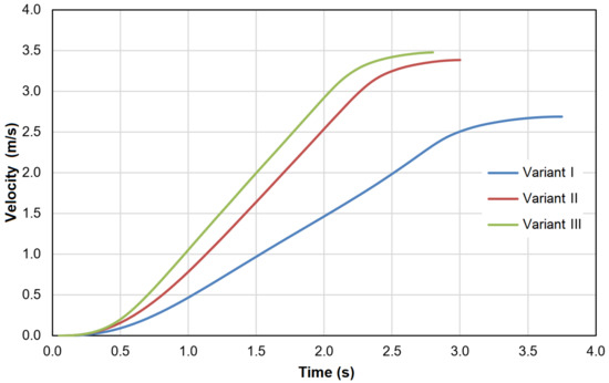 It should be mentioned that the presented test results are averages of the measurements taken. In addition, the measurement results obtained are subjected to a rather significant error (estimated at even 10%). This is due to the method of data processing. The image recorded with the camera for the fast movement was analyzed “frame by frame”, determining the displacement of the hammer between the individual frames of the video. Based on the frequency at which the pictures were taken (0.12 ms), the speed characteristics were determined. The moment of the termination of the simulation and the tests carried out was assumed to be the moment of the alignment of the ferromagnetic rings.