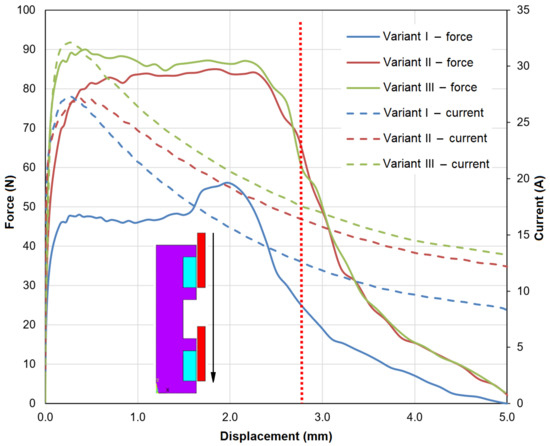 The simulation results in Figure 19 confirm the calculations beforehand and are in line with the theory of electromagnetism. It is obvious that for Variant I, even if the parasitic effects of eddy currents are taken into consideration, due to the incorrect winding of the coils, the velocity of the hammer is still at the lowest value. Maintaining the principle of push-wound coils for this case allows a significant increase in the final velocity. This is clearly shown in the course for Variant III. Unfortunately, in Variant III, there is the fault of the result related to the measurement of eddy current losses. The purpose of selecting such configured variants was to determine the percentage impact of model simplifications and thus the influence of eddy currents. The error of Variant II—which the authors indicate as the target, i.e., coils wound in opposite directions—considering the eddy currents is less than 10% in comparison to Variant III. The natural conclusion, referring to previous observations (Figure 19), is the simulation results from Figure 22. The results are related to the value of the ponderomotive force and current in the coil as a function of the position of the hammer with the position of the ferromagnetic rings. Despite the simplification, which is the presentation of the actuator core model as having a plane geometry with axial symmetry, the results of the tests and simulations carried out show very good compliance. This applies to both the value for the hammer velocity and the duration of the movement. Of course, this was possible due to the eddy current phenomenon as a boundary condition. Figure 21, Figure 22 and Figure 23 show the magnetic induction field distribution for the three variants presented. Only for Variant II do the magnetic induction lines close through the core, hammer and air gap. It is worth noting that the correctness of the line closing is analogous for each hammer displacement (1 mm, 2.5 mm and 4 mm). A small part of the energy stored in the capacitors is dissipated. The value of this dispersion has a direct impact on the velocity of the hammer.