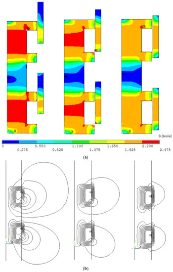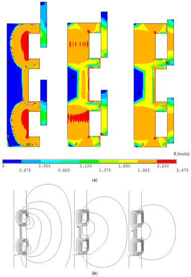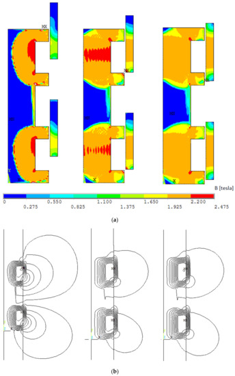 Magnetic field (a) and magnetic field lines (b) for hammer displacement (from the left): 1 mm, 2.5 mm and 4 mm—Variant II.