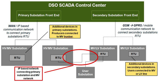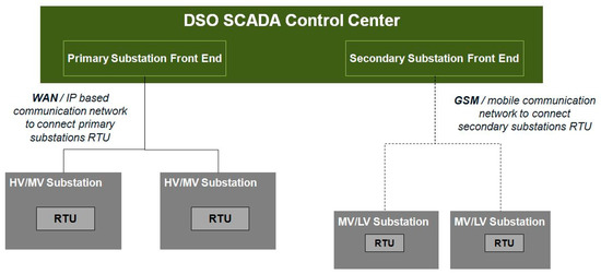 In Italy, at the Primary Substations level, the traditional Network Management System is installed. It has an interface with a SCADA central system exchanging information about the HV/MV Transformers, the Substation’s switches state, voltage, and the feeders’ current measurements. All the Primary Substations are controlled by a SCADA with an IP-based (always-on) connection. Then, a few Secondary Substations exchange information with the SCADA regarding the MV/LV Transformer state, the Substation’s switches state, and, in some configurations, the voltage and feeders’ current measurements too. With respect to the telecommunication infrastructure, substations are typically connected via a GSM connection. This architecture is illustrated in Figure 1.