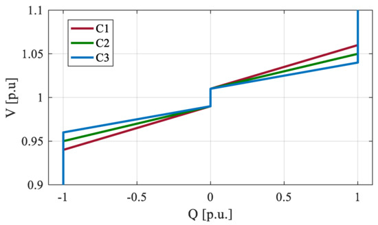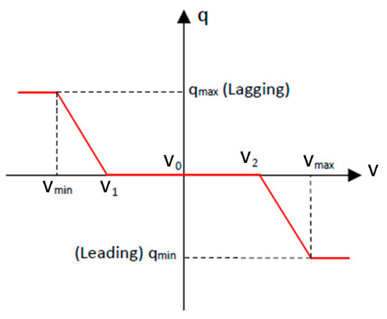 Nowadays, Grid Codes already rule the direct contribution of DG units to voltage control at the PCC. In [26], with respect to the Italian scenario, authors have already investigated the possible solutions proposed by the national grid code and pointed out the achievable performances. In all the proposed control laws, a DG unit is going to contribute to the voltage control simply by evaluating the real-time voltage phase at the PCC; eventually, maximum/minimum thresholds are imposed to the control law, in order to preserve the dynamic stability. Thus, all the methods involve two conditions: a normal operating situation, and a situation where first thresholds are violated. Among all the presented strategies in [26], the volt–var control, illustrated in Figure 3, shows better performances regarding increasing the HC and containing energy losses. Interestingly, papers [54,55] study similar Local Strategies applied in the LV grids of photovoltaic plants [54] and prosumers [55], and similar conclusions are drawn regarding the volt–var control. In normal operation, the measured voltage stays within the first threshold defined by the range (V1; V2), and thus the DG unit operates at the unitary power factor; if the measured voltage is outside the range (V1; V2), then the DG unit’s reactive power will change linearly with the violation of the first thresholds until the maximum value is reached.