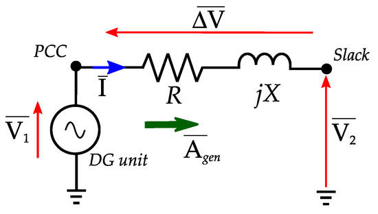 Given a feeder and a DG unit exchanging power with it (Figure 4), the voltage drop over the line can be easily calculated as a function of the DG’s generated power and line impedance. Therefore, denotes the voltage phasor at the PCC; , the voltage phasor at the receiving end of the line (in general terms, the point of connection with the primary HV/MV transformer, therefore, the slack bus); , the complex impedance of the considered line; , the current phasor flowing from the DG unit to the slack bus, and the complex power generated by DG. Accordingly, one can obtain the voltage drop phasor: