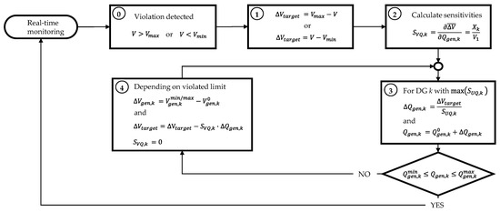 The flowchart of Figure 5 resumes the main steps of the proposed procedure. First, if during real-time monitoring of the DN a voltage violation is detected (step 0 in Figure 5), the SCADA will calculate the voltage drop target, i.e., , and the voltage drop sensitivities with respect to the DG’s reactive power, i.e., (steps 1 and 2 in Figure 5). Then, a fast iterative process is engaged in order to determine the amount of reactive power necessary to solve the voltage violation, i.e., : first, the DG with maximum sensitivity is selected, and is determined (step 3). If, applying this variation to the current reactive power produced by the DG, i.e., , does not lead to a reactive power limits violation, then the selected generator can fully mitigate the voltage violation, and the process is stopped by applying the new reactive generation level, . If a reactive power limits violation occurs, then is set to the violated limit, and are updated accordingly, while the sensitivity of the currently considered DG is removed from the database (step 4 in Figure 5). At this point, a new iteration is executed by going back to step 3.