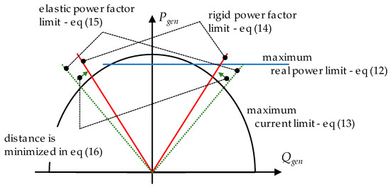 Figure 6 shows that the regulatory minimum requirements are tighter than the physical capability of the DG. From the operational point of view, this means that respecting the regulatory framework’s minimum requirements will, in general, stress the DG to a lesser extent. Therefore, there is no motivation for the plant owner to go beyond the regulatory framework requirements, and thus, these limits need to be correctly modeled. While constant band limits can be modeled by extending (11) to all generators, the power factor limit needs to be modeled separately: