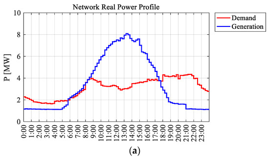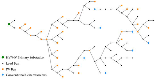 In a DN, the slack generator is represented by the HV External Grid connected at the HV side of primary Substation’s busbar. Moreover, unlike in a transmission network, in a DN, the voltage profile no longer mainly depends on the reactive power flow, as the P–V decoupling hypothesis is no longer true given the high R/X ratio. Therefore, it is possible to modify the voltage profile by also changing the real power of all the generators (not only the slack bus). On the other hand, this should be avoided as much as possible, due to economic reasons; for example, renewable plants normally operate at maximum available power, and their redispatch would essentially mean the curtailment of a part of their production capacity. In this context, the objective function can be reformulated as follows: