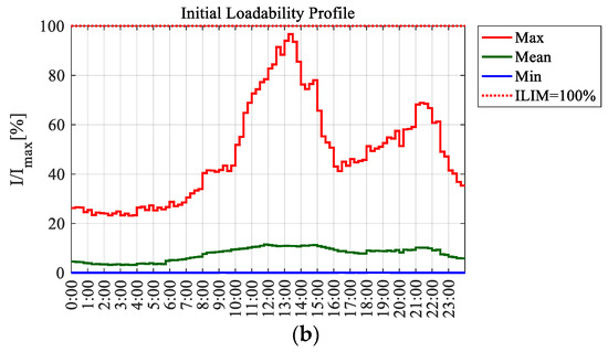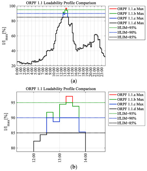 Equation (17) introduces a high degree of non-linearity, which has a negative impact on the computation time of the ORPF. Thus, to limit this effect, Equation (17) is written only for the branches for which the initial current is above a certain threshold. Setting the threshold at 80% results in the insertion into (17) of all branches that could suffer current violations in the final ORPF solution.