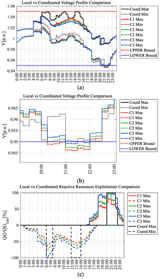 With respect to other CVC approaches present in the literature and thoroughly analyzed in the Introduction section, the proposed Coordinated Control has the advantage of being easily implementable in the majority of state-of-the-art DNs. Indeed, the investigated CVC approaches from the literature were either suitable for small DNs (therefore, microgrids), or they were specialized optimization approaches that, when implemented in a large real DN, required a level of development of the SCADA suited to a Centralized algorithm. However, the proposed Coordinated Control can be easily integrated in a large grid as, nowadays, many DNs are already Local Control-ready, which means that the local measurement of DGs’ plant voltages and powers is already possible; they just need to be properly integrated in the SCADA.